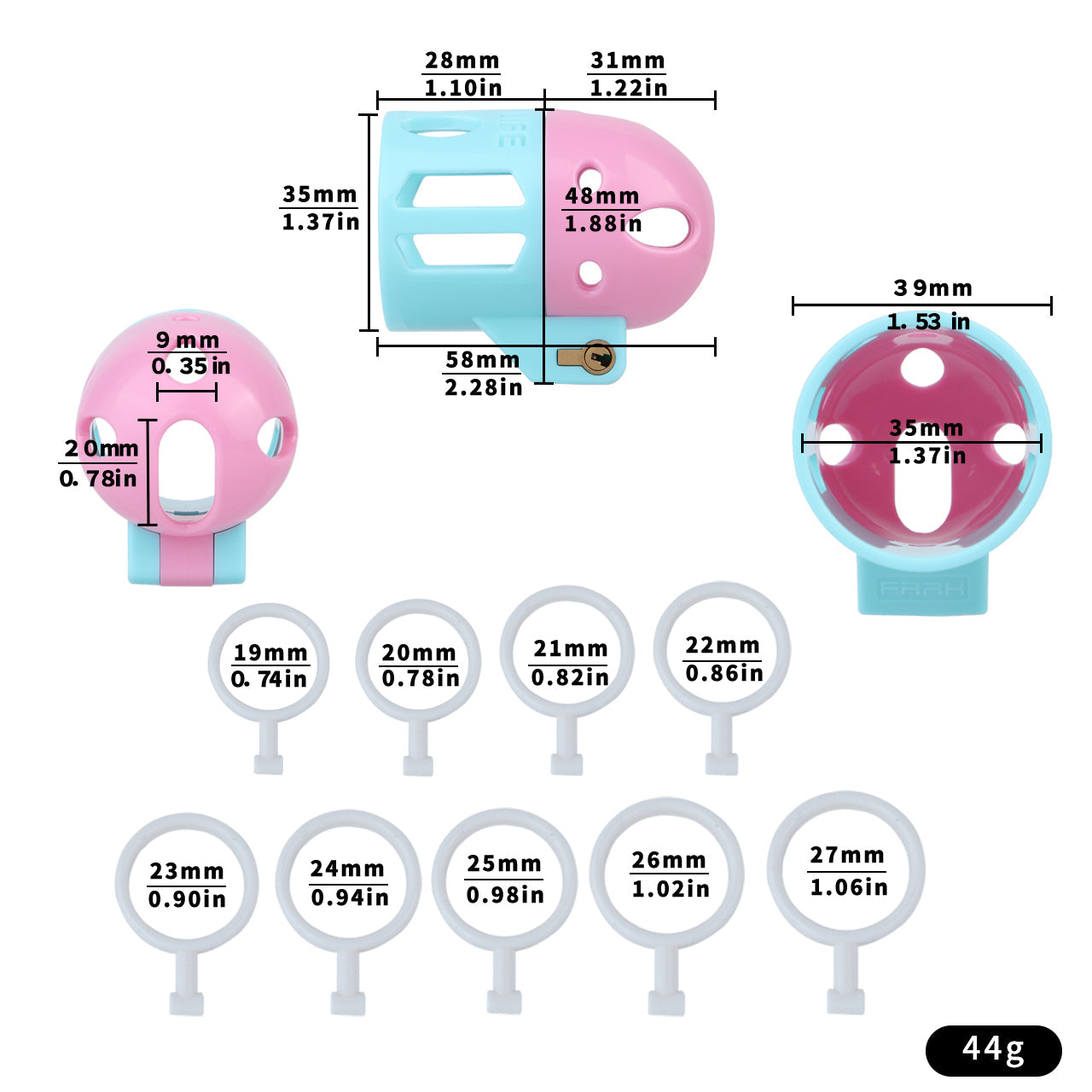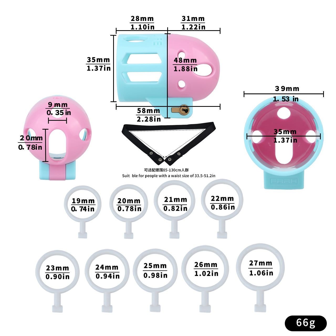 Introducing the Bullet-Shaped Ringless Chastity Cage—crafted from smooth, lightweight ABS resin for superior comfort and lasting durability. Its innovative ringless design enables a discreet fit, while the detachable structure makes daily cleaning and maintenance effortless. The open-style ventilation promotes airflow, keeping you cool and fresh throughout the day. Featuring a coronal sulcus ring for a secure fit and side-hole unlocking for easy release, this cage offers dependable protection. Available in multiple colors including pink, blue, black, and white, it pairs seamlessly with a belt for added stability. The downward curvature minimizes visibility beneath clothing, making it ideal for everyday wear. Suitable for waist sizes 85–130 cm, with a range of ring options from 19mm to 27mm. Embrace confidence and security with this thoughtfully designed, versatile accessory.